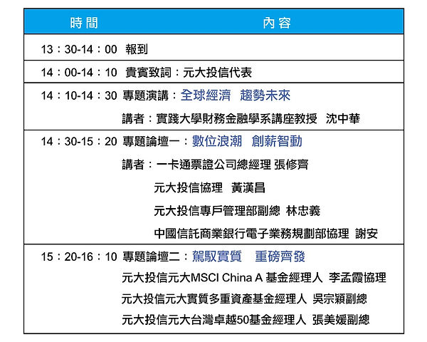 為使投資人得以更靈活運用投資工具及資產配置,本次【2018年財富趨勢巡迴論壇】以下半年全球市場為主軸,探討在微利時代下的理財面面觀,藉由論壇舉行與投資人面對面,展現出元大投信在財富管理之專業與精準,期掀起財富管理的新頁章!
